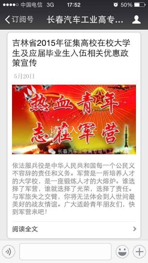 另外,各学院还通过网站、微信公众平台、飞信群、QQ群、宣传板、海报等方式,加大征兵工作宣传力度,营造积极浓厚的参军入伍氛围,激发学生投身国防事业、铸就强军梦的爱国主义情怀。