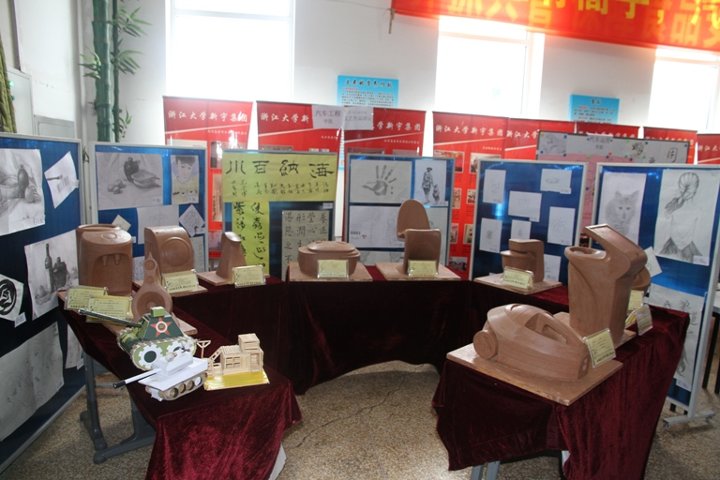 本次参展的书法作品分为书画、手工艺品两大类,每一个展品都有详细的介绍,其中有解放卡车模型、飞机模型、黄铜和铁板制作成得徽章和动物造型工艺品、废旧筷子制作的房屋、废旧塑料袋设计的服装、废旧纸板制作的各种物品、油泥模型等,各具特色,博采众长,诗画作品栩栩如生,用各种废旧品制作的精美手工作品也惟妙惟肖,吸引了众多学校领导、学生前来观看。