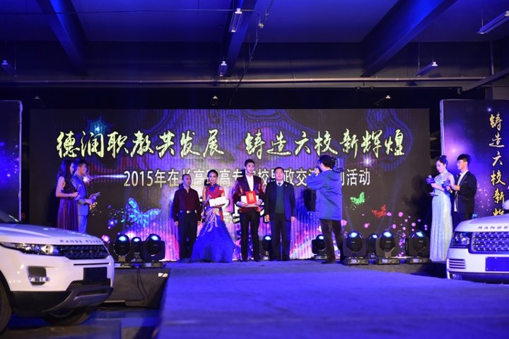 为加强吉林省在长高职高专院校校际间合作交流,推动职业教育发展,发挥学校思政教育的引领作用,“德润职教共发展,铸造六校新辉煌”高职高专院校形象大使评选暨2015年在长高职高专院校思政交流系列活动颁奖典礼于2015年12月09日在长春汽车工业高等专科学校培训基地隆重举行。恰逢“长春市高校文明杯检查小组”的领导莅临我校指导工作并一同参加了本次活动,他们是中共长春市委宣传部高教处处长郑学华,中共长春市委宣传部高教处副调研员崔静,长春师范大学党委宣传部部长陈爱梅,长春工业大学党委学生工作部思想教育科科长包卓,东北师范大学人文学院基层学院党总支副书记李树民。同时我们也邀请了吉林省教育厅高校思政处副处长王宏阁,吉林交通职业技术学院党委副书记李廷吉,长春职业技术学院副院长吕一枚,长春医学高等专科学校副校长杨永太,长春金融高等专科学校党委副书记赵剑辉,吉林司法警官职业学院党委副书记周敬军,长春汽车工业高等专科学校副校长明晓辉,长春汽车工业高等专科学校校长助理胡国良以及在长六所高职高专院校的学生处处长、学生工作部门的老师们、长春汽车高专的部门领导和各学校学生代表800余人参加了在长高职高专院校形象大使评选暨2015年在长高职高专院校思政交流系列活动颁奖典礼。也有幸邀请来了吉林电视台栏目主编、著名主持人贺奇,吉林交通职业技术学院团委书记侯军,长春职业技术学院团委书记王硕菲,长春金融高等专科学校团委副书记杨扬,吉林司法警官职业学院团委书记王丽莉,长春医学高等专科学校团委书记刘力为,长春汽车工业高等专科学校校团委副书记赵良富担任本次形象大使评选的评委老师。