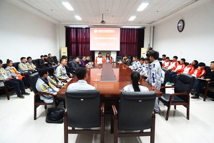 参会各少数民族学生代表在座谈会上畅所欲言,现场气氛融洽、笑声不断。同学们在介绍本民族文化、风土人情、生活习惯的同时,建议学校成立少数民族社团、举办少数民族文化展等活动,增进各民族之间的沟通了解。苗族同学何斯田在发言中说,在汽车高专学习两个月“感觉非常好”,班主任老师充分考虑了少数民族同学生活上的困难,同时,他还讲述了苗族的芦笙节的故事。回族同学马鑫源谈到,就学校超市的清真食品种类单一等问题提出了自己的意见。副校长明晓辉还就土家族同学黄帆提到的因语言不通,听课效果较差的问题给出了建议,建议他有计划地诵读新华字典,这样会在短时间内对掌握普通话大有帮助。在副校长明晓辉问到少数民族同学通过什么渠道来到汽车高专时,同学们答到:“学挖掘机去蓝翔,学汽车来汽车高专”!明校长语重心长地说:看似同学们的一句玩笑话,但它确是同学们的期许,是学校的使命与责任,让我们共同努力把学校越办越好!