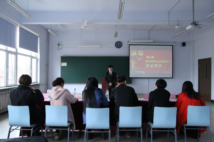 为贯彻党的十九大精神,坚持用习近平新时代中国特色社会主义思想武装团员青年,加强新时代思想政治引领,创新推进我校“青年马克思主义者培养工程”培训班、党校培训班建设,充分发挥马克思主义在思想建设中的重要作用,我校于2018年4月3日下午在公共教学楼B区105、106室开展第三期“青马工程”培训班学员选拔面试工作。特别邀请公共教学部思政教研室主任辛德娟、思政教师王之求担任面试专家评委,面试评委还有校团委书记赵良富、校团委办公室及学生处老师。