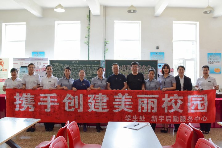 为深入贯彻落实社会主义核心价值观,加强学生思想道德教育,营造健康和谐向上的校园文化氛围,2018年6月4日中午11:30,由学生处、新宇公寓中心共同开展的“寝室文明月”活动启动仪式在食堂一楼举行。学生处副处长王伟、徐志鹏老师、姜楠老师、公寓中心办公室人员及各公寓楼长参加了此次启动仪式。