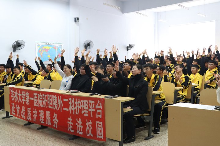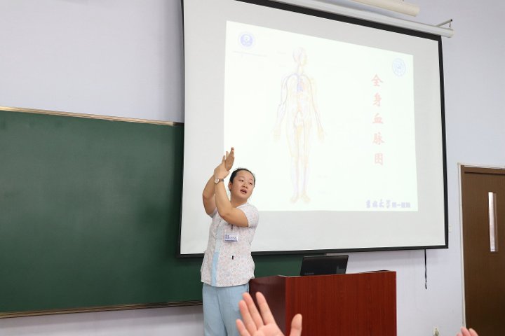 汤赫男主管护师将急救包扎处理的理论知识与日常实际相结合,浅显易懂地介绍了止血、包扎和固定等技术,向同学们传授了急救手法和注意事项,利用专业知识进行剖析,与学生认真细致的互动交流中,就有关知识进行了详细的阐述。