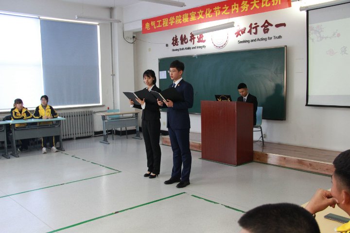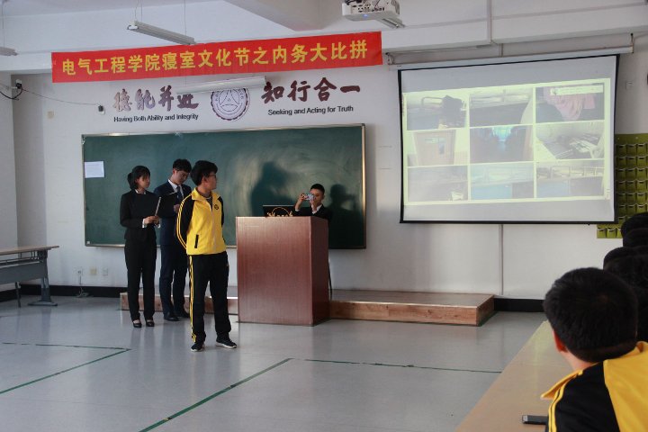 寝室文化节内务大比拼在八公寓拉开序幕,首先,选出十个寝室进行现场内务整理,由学生处,公寓中心和各学院老师进行打分。随后来到机电楼401教室,把各学院优秀寝室进行视频展示,展示出各学院宿舍温馨快乐的场景。作为评比中的一项指标,由各位老师现场打分;接下来选拔出的各学院周四大检内务照片,作为第三项指标,由各位评委点评。最后,在大家紧张的等待比赛结果期间,为大家准备简单放松的游戏——你是我的眼。每院有四人参赛,分为两组,由一男一女组成,参赛者带着眼罩行走,另一位用语音指挥参赛选手通过所有障碍,每踩到一个障碍加五秒,时间短者获胜。最终比赛结果为:一等奖:电气工程学院男生组;二等奖:电气工程学院女生组,汽车运用学院男生组。三等奖:汽车运用学院女生组,机械工程学院男生组,汽车工程学院男生组;优秀奖:汽车工程学院女生组,汽车营销学院女生组,汽车营销学院男生组,机械工程学院女生组。