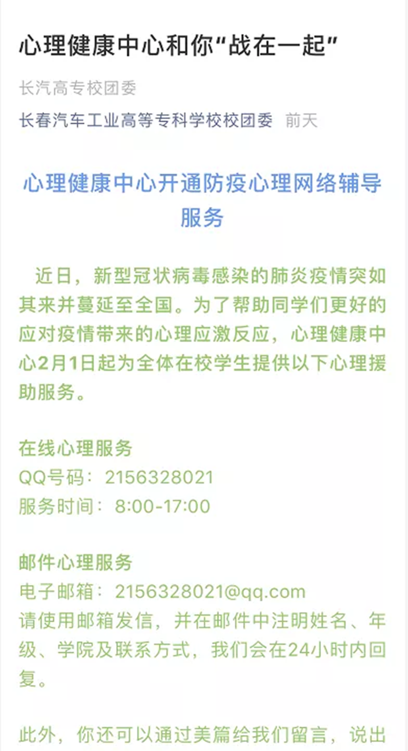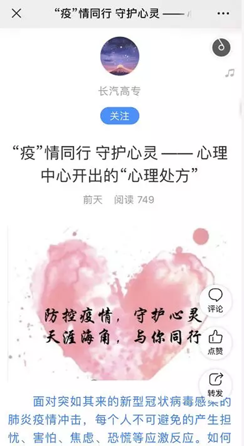 学生处心理健康中心迅速启动了应急心理危机干预机制,积极开展各项心理防控和援助工作,开通防疫心理网络辅导服务,对全体学生、教师提供心理援助服务;梳理出了“疫情”发生后的应激反应与心理应对措施,为全校师生开出了充满温暖的“心理处方”。