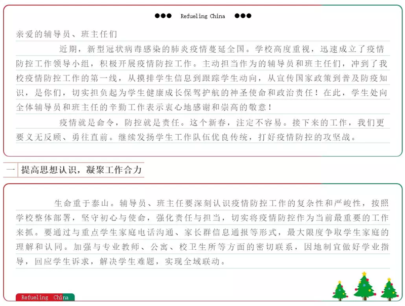 为加强新型冠状病毒感染的肺炎防控工作,学生工作处明确了关于企业实习、放假在家、春节留校学生安全防控工作相关事宜,强化了辅导员、公寓中心的值班工作,实行疫情防控“零”报告制度,多方位开展防控工作。