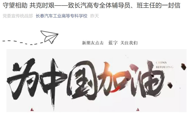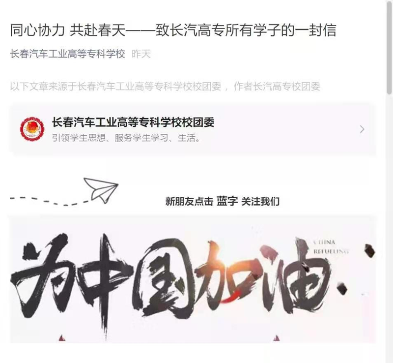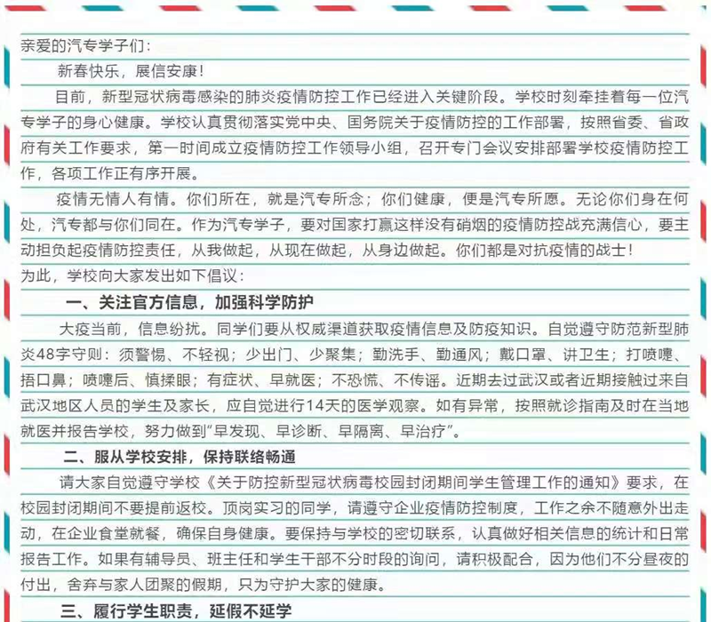 推送“共克时艰 共赴春天——致汽专学子的一封信”。向全校学生致以亲切的问候,送以美好的新年祝福,赠以有爱的倡议,疫情无情人有情,无论你们身在何处,汽专都与你们同在。