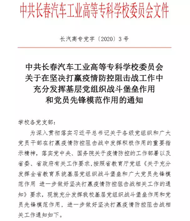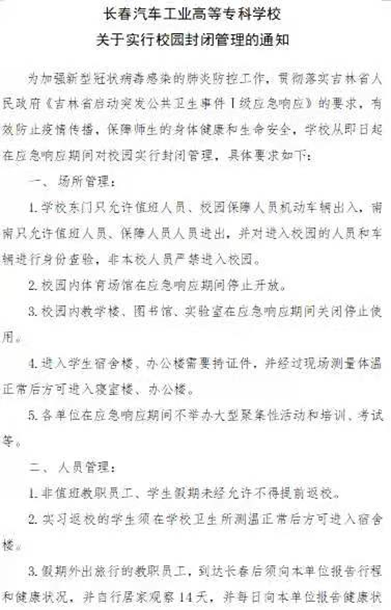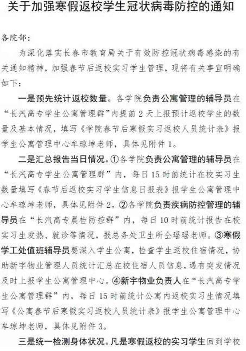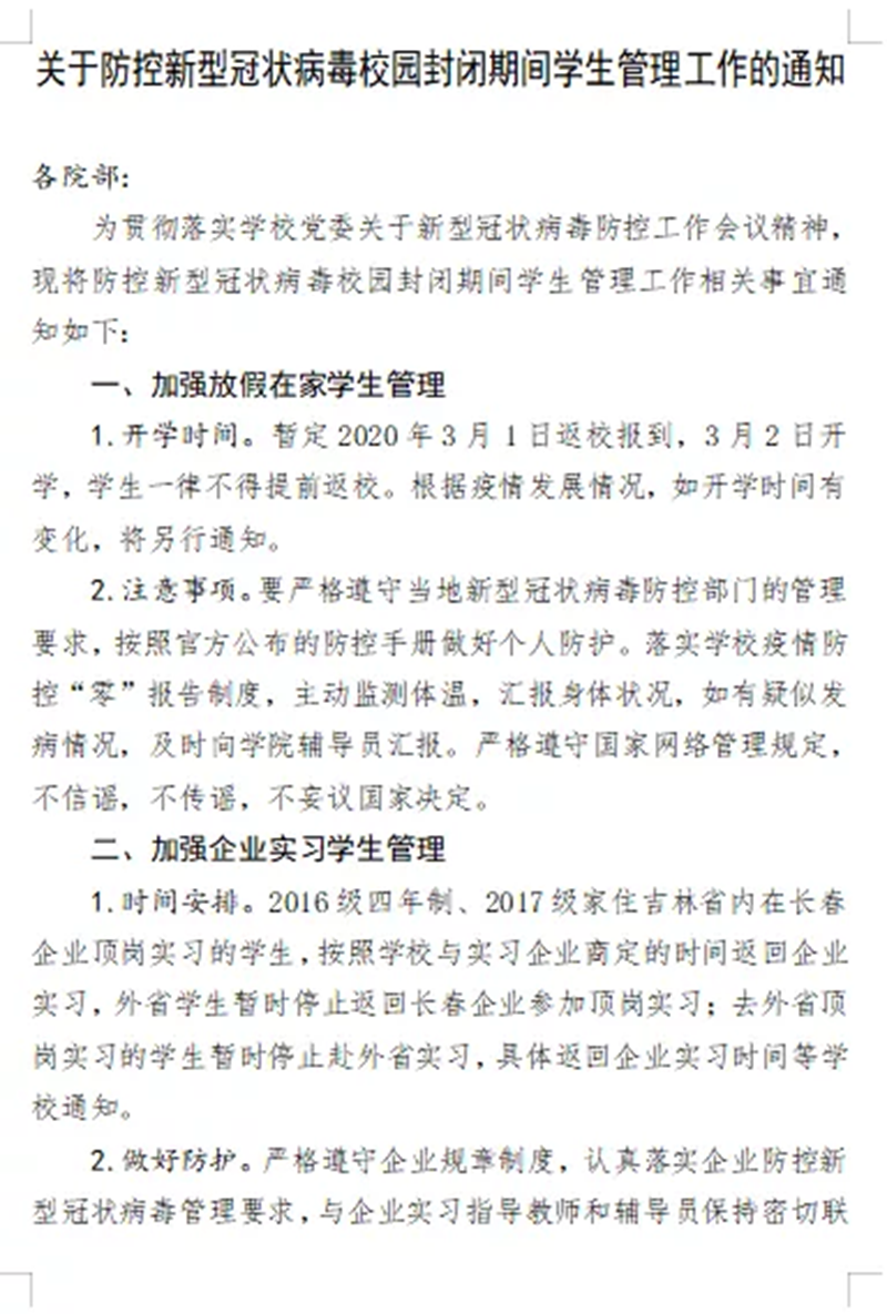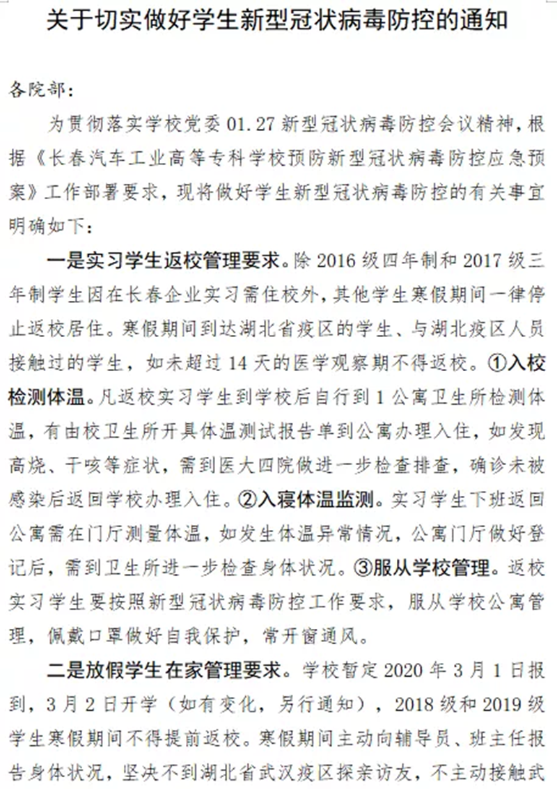 为贯彻落实学校党委01.27新型冠状病毒防控会议精神,根据《长春汽车工业高等专科学校预防新型冠状病毒防控应急预案》工作部署要求,学生工作处联合各院部制定了关于校园管 理以及实习、放假学生安全防控的有关事宜。