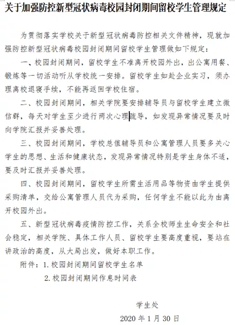 发布关于加强防控新型冠状病毒校园封闭期间留校学生管理规定