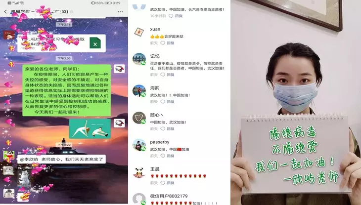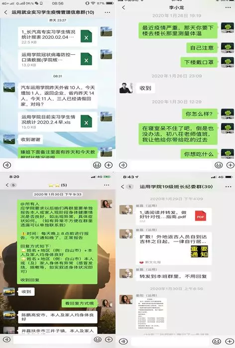汽车工程学院抗击病毒小分队,针对赴武汉湖北或与其有接触史的学生,夏经纶、张冬等教师对其进行日常关注与心理辅导。