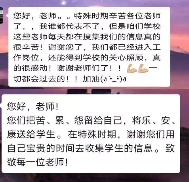 有这样一群教师,随风入夜静润物,因工作安排,他们无法深入学校抗疫一线,但是有一种关心,叫做默默无言。每日在家工作至深夜的他们,认真落实“日报告”“零报告”制度,持续掌握学生动态,维护全校学生数据,及时全面了解每一个学生的情况。