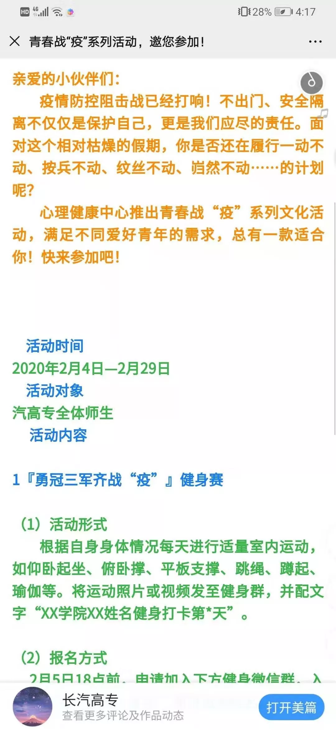 开展系列主题文化活动,一起“云健身、云读书、云游戏”让学生足不出户也能更好地充实自我,共同成长。
