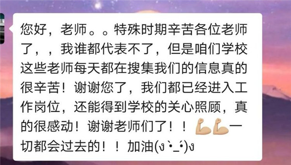 有这样一群教师,随风入夜静润物,因工作安排,他们无法深入学校抗疫一线,但是有一种关心,叫做默默无言。每日在家工作至深夜的他们,认真落实“日报告”“零报告”制度,持续掌握学生动态,维护全校学生数据,及时全面了解每一个学生的情况。