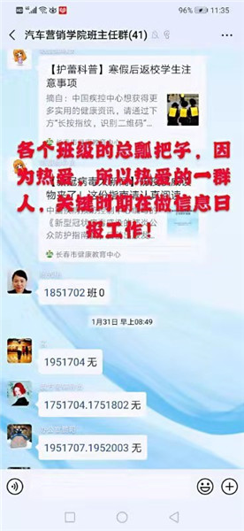 汽车运用学院抗击疫情小分队,针对各种情况的学生,逐一进行调查了解、信息推送、心理疏导,为学生健康与平安保驾护航。