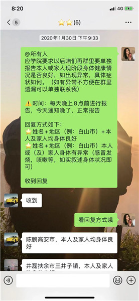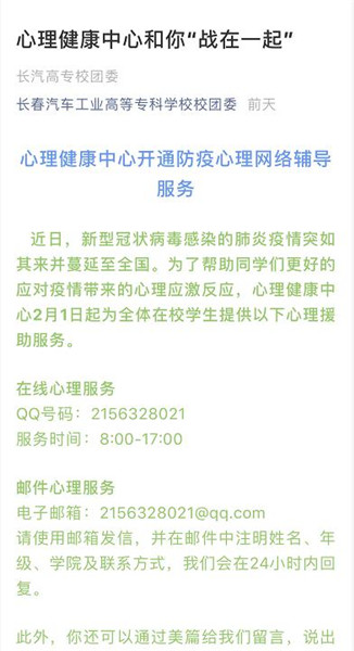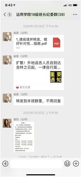 汽车工程学院抗击病毒小分队,针对赴武汉湖北或与其有接触史的学生,夏经纶、张冬等教师对其进行日常关注与心理辅导。