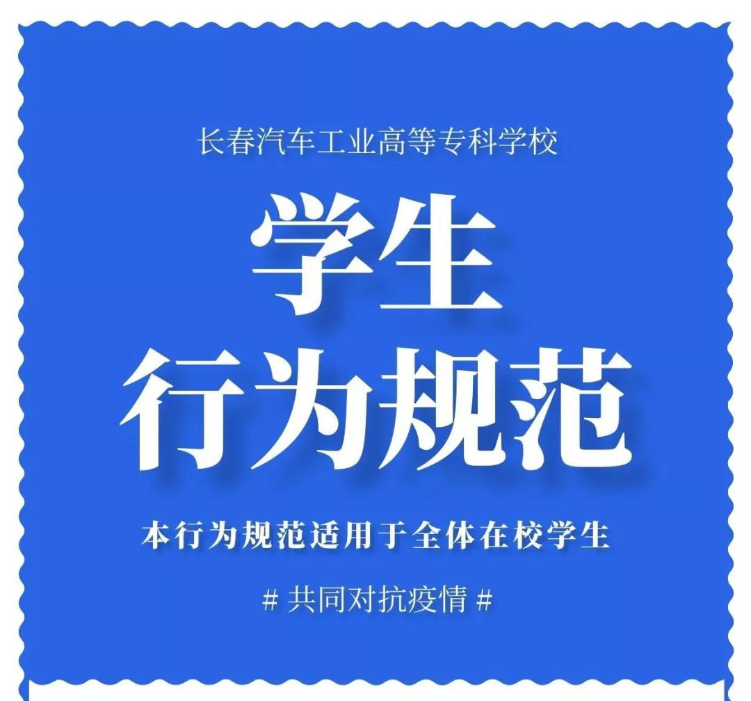 为加强新型冠状病毒感染的肺炎疫情防控工作,全力遏制疫情蔓延,坚决打赢疫情防控阻击战,特制定《长春汽车工业高等专科学校新型冠状病毒感染的肺炎疫情防控时期学生行为规范》。本行为规范适用于全体在校学生。