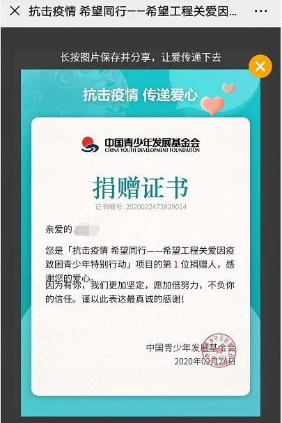 设立“关爱抗疫医务人员子女”专项基金,接受社会爱心捐赠,中国青基会不收取项目管理服务费用。捐款方式如下: