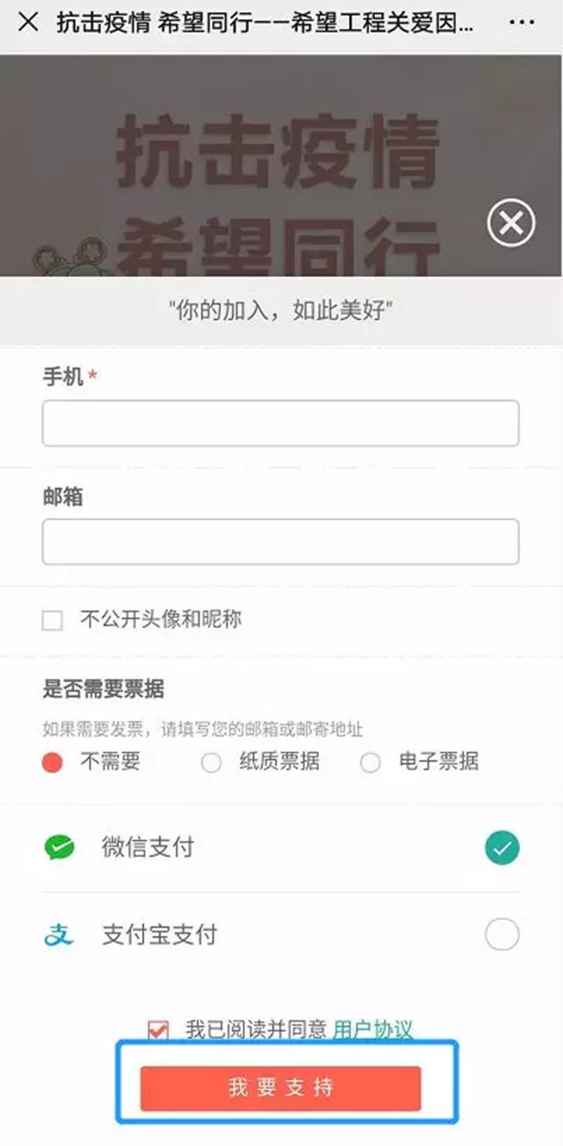 第四步:选择是否需要发票,点击“我要支持”完成捐赠