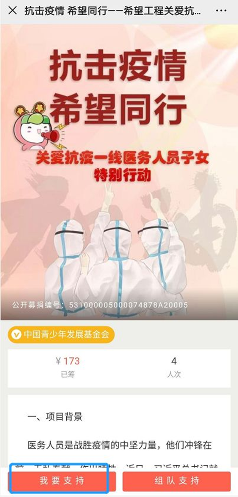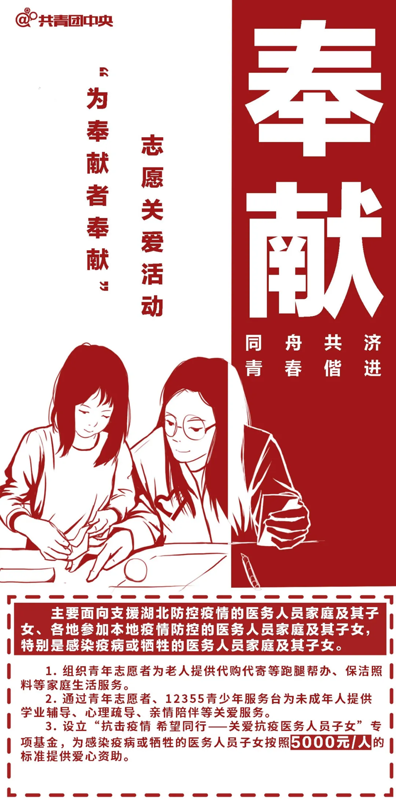 为贯彻落实习近平总书记重要指示精神,在共青团中央部署开展“同舟共济、青春偕进”关爱帮扶受新冠肺炎疫情直接影响的青少年特别行动的整体框架下,中国青基会联合33家省级青基会共同开展“抗击疫情、希望同行”——希望工程关爱抗疫一线医务人员子女特别行动,向奋战在抗疫一线的医务人员致敬,向他们的子女提供关爱,传递党的关怀和社会主义大家庭的温暖。