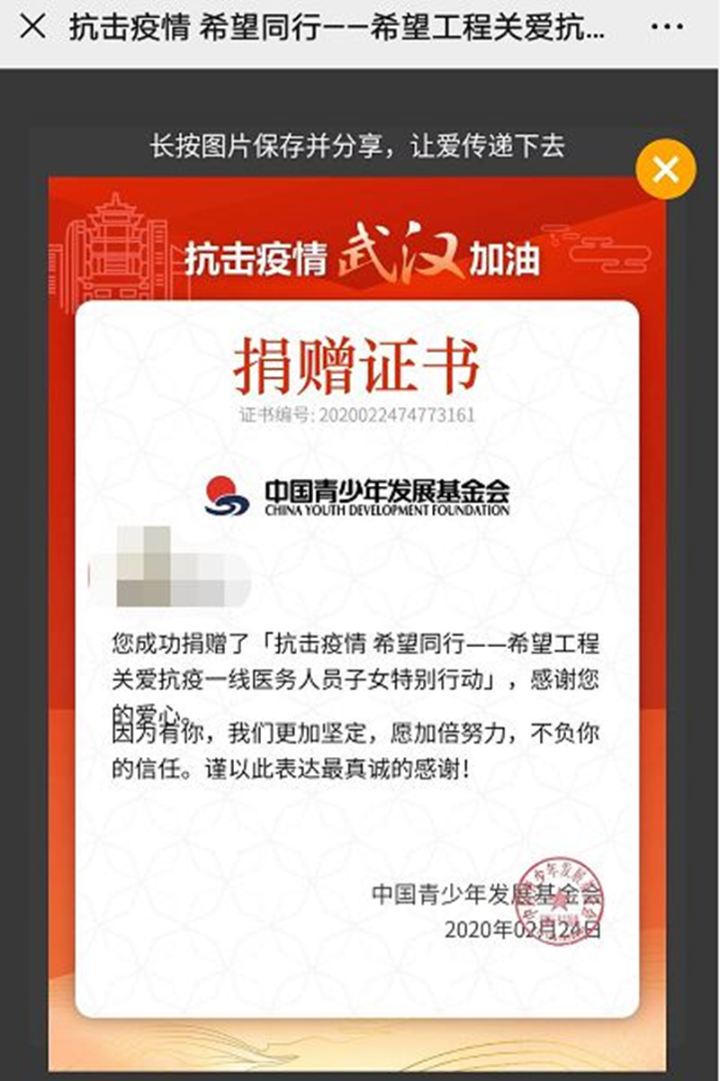 开户行:中国工商银行北京东四南支行户 名:中国青少年发展基金会账 号:0200001029014484859汇款请备注:关爱抗疫医务人员子女