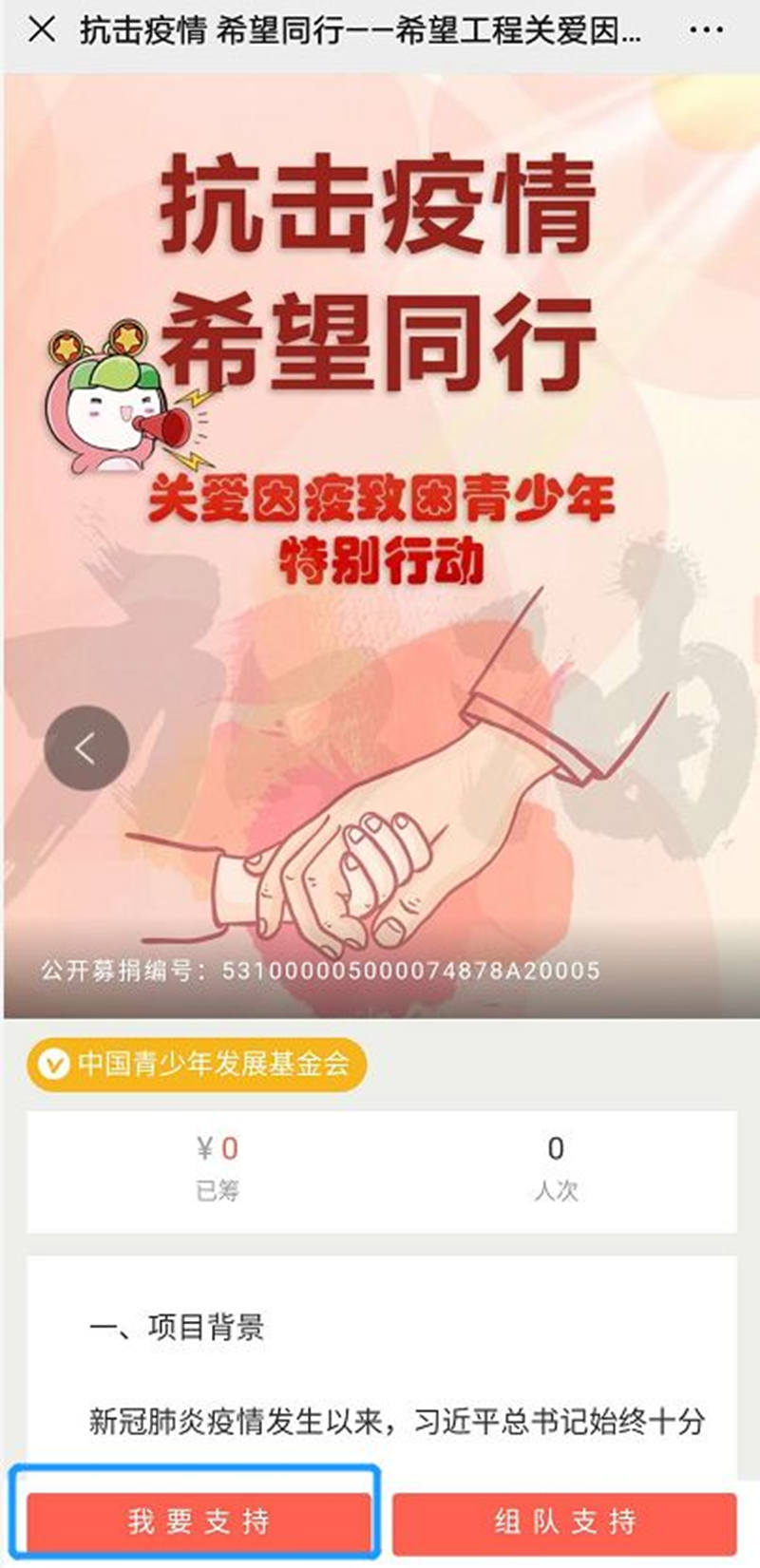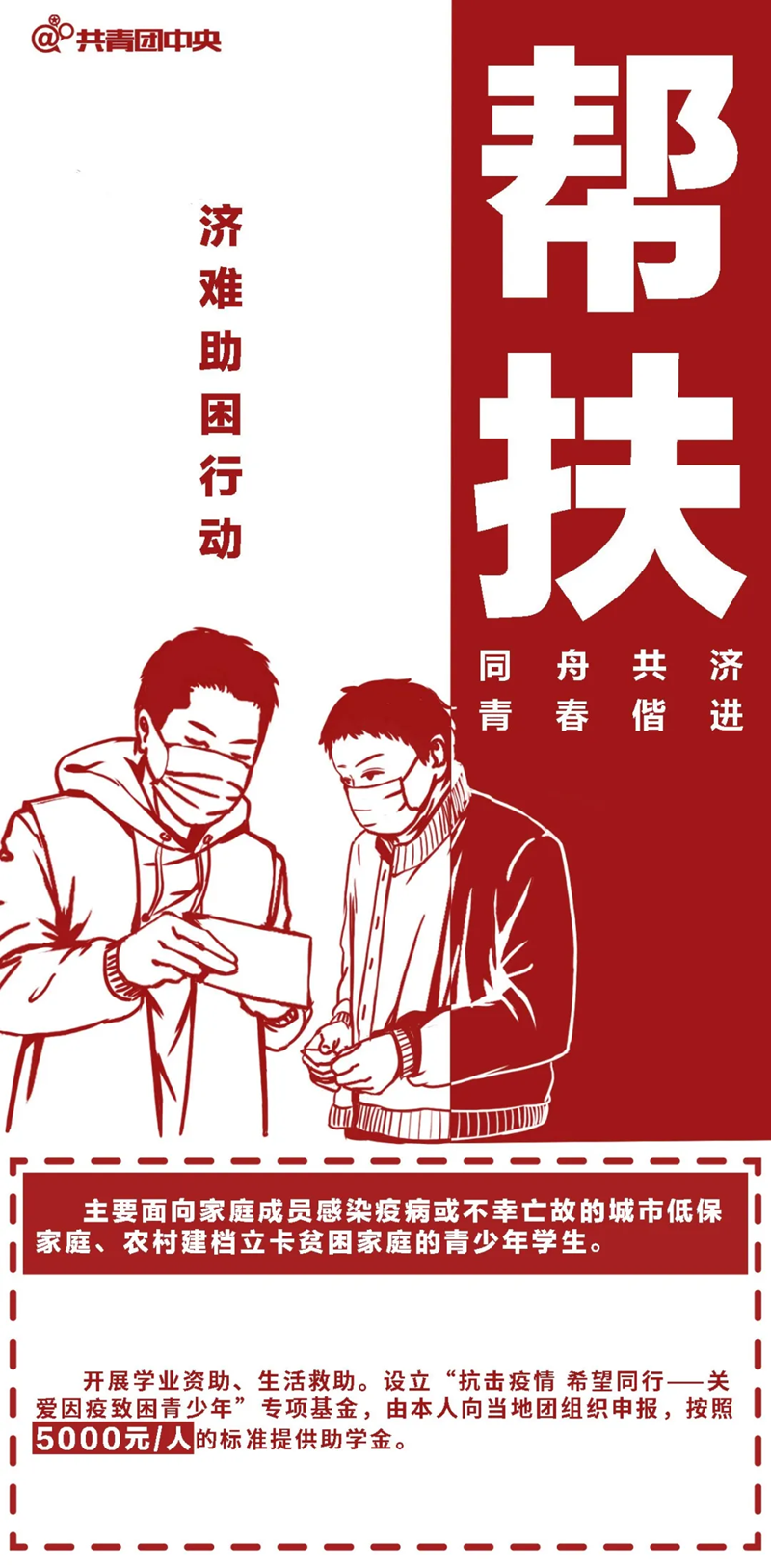 为贯彻落实习近平总书记重要指示精神,在共青团中央部署开展“同舟共济、青春偕进”关爱帮扶受新冠肺炎疫情直接影响的青少年特别行动的整体框架下,中国青基会联合33家省级青基会共同开展“抗击疫情、希望同行”——希望工程关爱因疫致困青少年特别行动,向因疫情致困、返贫家庭的青少年学生提供助学金,帮助他们解决实际困难、顺利完成学业,传递党的关怀和社会主义大家庭的温暖。