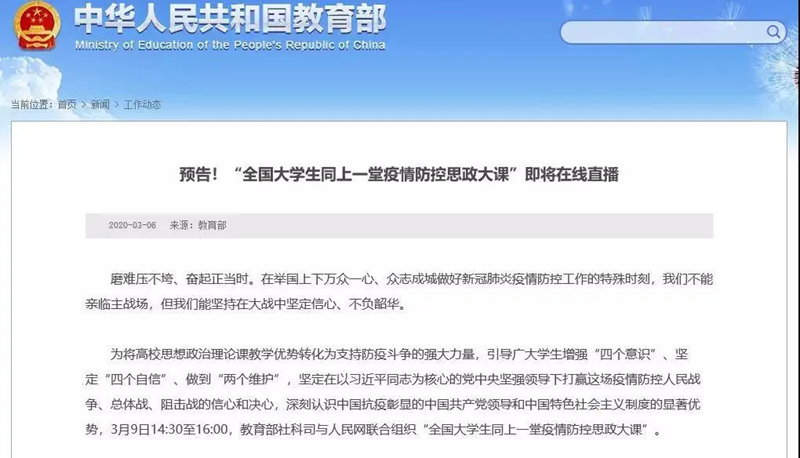 教育部官方网站今天发布“全国大学生同上一堂疫情防控思政大课”即将在线直播预告:3月9日14:30至16:00,教育部社会科学司与人民网联合组织“全国大学生同上一堂疫情防控思政大课”,欢迎关注。