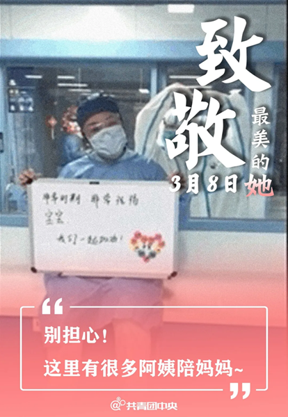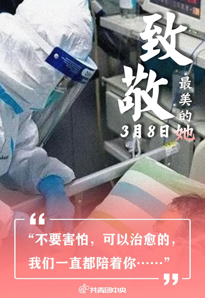 广大女医务人员积极响应党的号召,义无反顾冲上疫情防控第一线;她们训练有素、医术精湛、医德高尚;她们不畏艰险、夜以继日、连续奋战,展现了救死扶伤、医者仁心的崇高精神,用实际行动书写了中国女性敢于担当、甘于奉献的动人故事。