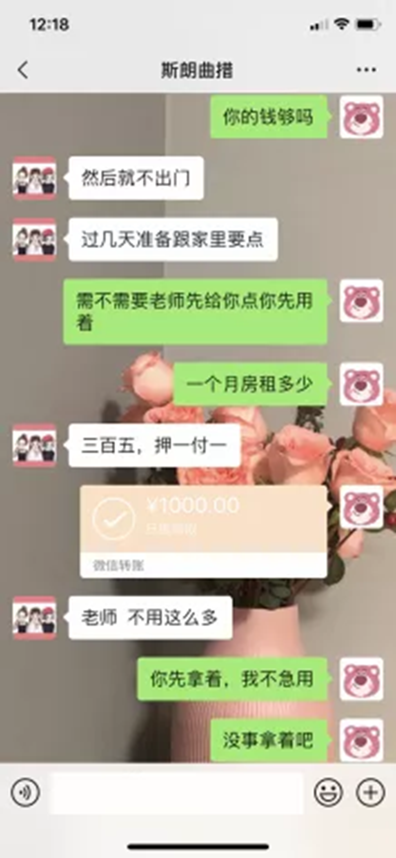今年是我国决战脱贫攻坚,决胜全面小康的收官之年,也是实现“两个一百年”奋斗目标的历史交汇之年。作为新时代高校辅导员,我有责任和义务做好助学工作,将资助工作落实好。今年冬天,新冠肺炎疫情突如其来的爆发,让实习的藏族学生无法回家与家人团聚,十天的假期一下子被无限期的延长了,这名学生在外租房住宿的成本也跟着增加,作为该生辅导员,我非常了解该生的家庭经济状况,该生家中有9个孩子,她排行第二,肩负着家中的重担,疫情导致该生实习工作被迫暂停,于是我代表学院资助了该生2000元钱以补贴该生的生活开支,让学生感受到学校的关怀,更让学生在不能和家人团聚的日子里感受到学校的温暖。停课不停助,将资助工作进行到底,将小我融入大我,为决战脱贫攻坚贡献一份力量。
