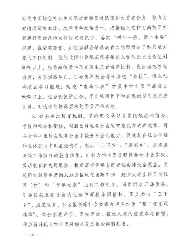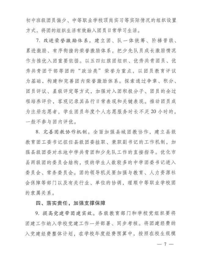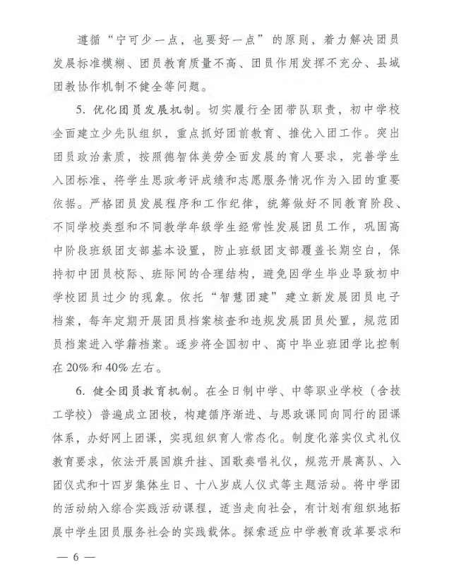 《若干措施》指出,中学共青团改革要正本清源,遵循“宁可少一点,也要好一点”的原则,着力解决团员发展标准模糊、团员教育质量不高、团员作用发挥不充分、县域团教协作机制不健全等问题。一是优化团员发展机制,切实履行全团带队职责,初中学校全面建立少先队组织,将学生思政考评成绩和志愿服务情况作为入团的重要依据,统筹做好不同教育阶段、不同学校类型和不同教学年级学生经常性发展团员工作,巩固高中阶段班级团支部基本设置,保持初中团员校际、班际间的合理结构,依托“智慧团建”建立新发展团员电子档案,定期开展团员档案核查和违规发展团员处置,规范团员档案进入学籍档案,逐步将全国初中、高中毕业班团学比控制在20%和40%左右;二是健全团员教育机制,在全日制中学、中等职业学校(含技工学校)普遍成立团校,构建循序渐进、与思政课同向同行的团课体系,制度化落实仪式礼仪教育要求,规范开展离队、入团仪式和十四岁集体生日、十八岁成人仪式等主题活动,将中学团的活动纳入综合实践活动课程,有计划有组织地拓展中学生团员服务社会的实践载体,探索适应中学教育改革要求和初中班级团员偏少、中等职业学校顶岗实习等实际情况的组织设置方式;三是改进荣誉激励体系,建立团、队一体统筹、阶梯晋级、累进激励、有序衔接的荣誉激励体系,把少先队员成长激励情况作为推优入团重要依据,以团的“政治类”荣誉为重点,以团员教育评议为基础,构建和完善团内荣誉激励体系,加强对入团积极分子、团员的全过程培养评价,学生团员年度个人志愿服务时长不足20小时的,一般不参与团内评优;四是完善团教协作机制,建立县级教育团工委书记担任县级团委挂职、兼职副书记的工作机制,加强县级团委对本地中学共青团和少先队工作的直接指导,优化市县两级团的委员会结构,吸纳学生人数较多的中学团委书记进入委员会、常务委员会,要理顺中等职业学校团的隶属关系。