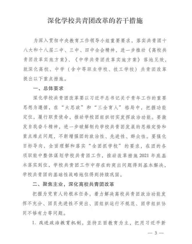 日前,共青团中央、中共教育部党组联合印发《深化学校共青团改革的若干措施》(以下简称《若干措施》),就深化高校、中学(含中等职业学校、技工学校)共青团改革提出12项重点措施。《若干措施》指出,深化学校共青团改革要以习近平总书记关于青年工作的重要思想为遵循,在“大思政”和“三全育人”格局中,推动学校团组织发挥政治功能。要激发自我奋斗精神,进一步破解制约学校共青团发展的思维定势和重点难点问题,不断增强团的政治性、先进性、群众性。要强化目标导向,全面理解和落实“全团抓学校”要求,推动改革措施2021年底基本落实到位。