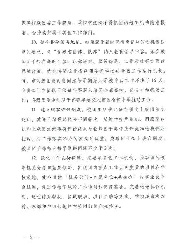 《若干措施》强调,深化学校共青团改革要落实责任,加强支撑保障。一是提高党建带团建实效,各级教育部门和学校党组织要将团建工作纳入学校党建工作一并部署、同步考核,将团建经费纳入党建经费计划,在学校经费预算中保障校级团委工作经费,不得把团的组织机构随意撤消、合并或归属于其他工作部门;二是健全指导落实机制,将“党建带团建、队建”纳入教育督导内容,落实教师团干部保障政策,优化省级团委抓学校共青团工作运行机制,省、市两级团委负责同志每学期深入学校推动工作不少于15天,其主责部门专挂职干部每年要深入辖区全部高校、部分中学推动工作,县级团委专挂职干部每年要深入辖区全部中学推动工作;三是建立述职评议制度,校团组织书记每年须向上级团组织述职,其评价结果反馈学校党组织,评价结果与教师团干部评先评优和选拔任用挂钩,教师团干部每人每学期讲团课不少于2次;四是强化工作支持保障,完善项目化工作机制,推动团内重点工作以可度量的项目在学校落地,健全团的“机关部门+直属单位+基金会”的事业化平台机制,促进工作协同和资源整合,推动城市和农村、东部和中西部地区学校团组织交流共享。