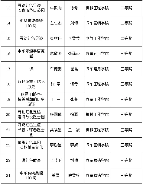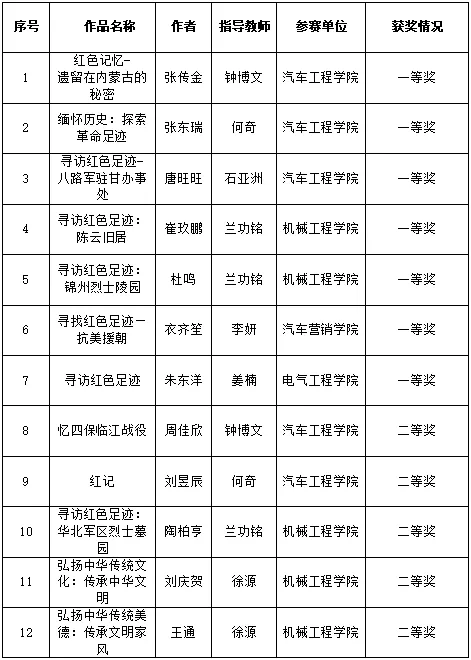 “传承的力量”微视频大赛是中国职业技术教育学会为大力弘扬中华文化,落实职业院校立德树人根本任务,而在全国职业院校中发起的国家级赛事。按照工作通知的要求,学生处(团委)、思想政治教研部、校工会联合策划组织了校级作品选拔赛,在各学院团总支的积极动员、指导下,共计百余个作品报名参赛,我校大赛组委会根据作品的主题性、创新性、艺术性等综合评定打分,共计24个优秀作品脱颖而出,具体如下: