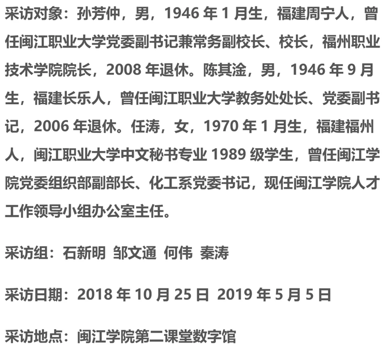采访组:孙芳仲校长、任涛老师,你们好!请回忆一下闽江职业大学办学的时代背景和习近平同志担任闽江职业大学校长后,你们第一次见面的情景。