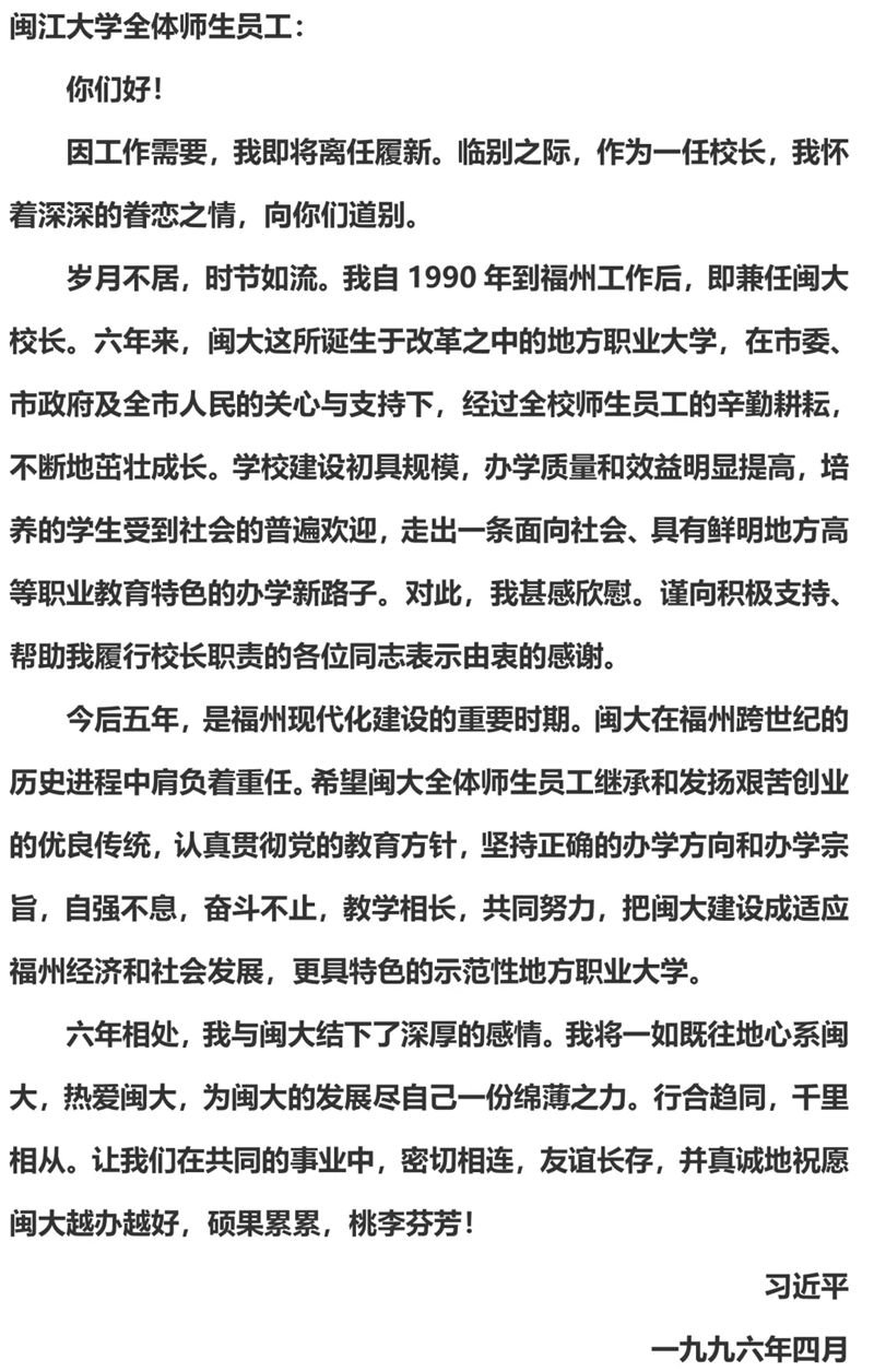 会议结束后,我们从三楼的会议室下来与习校长一起合影,刚好赶上学生下课。学生们听说习校长来学校了,纷纷从走廊向下观望,有不少学生还高呼“习校长好、习校长好”!习校长不时向同学们挥手致意。这是习校长在与闽大师生作告别,在场的许多人都眼含热泪。习校长离开学校不久后,亲自致信闽大全体师生员工,字里行间表达了对闽大师生的深厚情谊。
